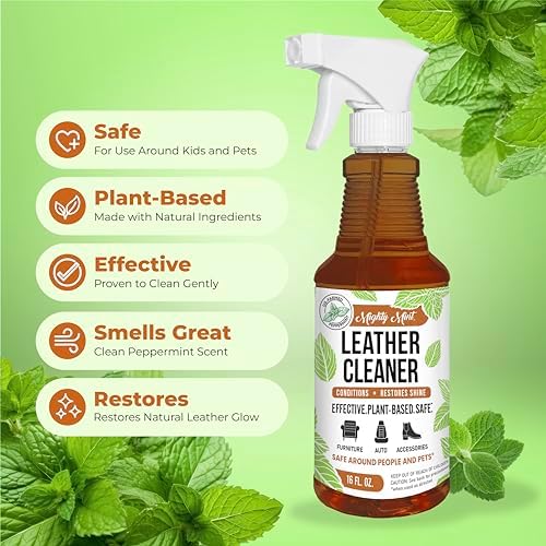 Mighty Mint Leather Cleaner is a plant-based solution designed for both natural and synthetic smooth leather. It safely cleans, revitalizes, and protects leather without leaving toxic residues. The formula gently moisturizes to prevent cracking, enhancing the leather’s natural beauty. Additionally, it neutralizes odors, leaving a subtle fresh mint scent. Safe for use around people and pets when used as directed, this cleaner is perfect for maintaining the quality and appearance of your leather items. Used for: handbags, shoes, couches, car interior, jackets, boots, purses, faux leather, jackets, sofas, chairs.