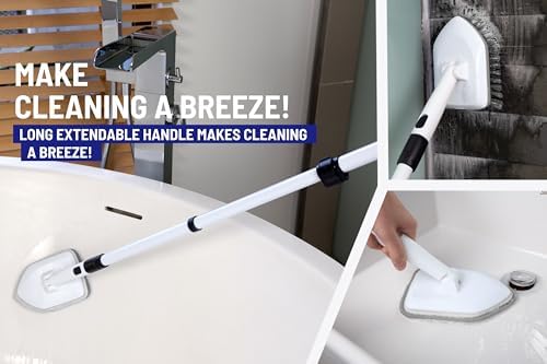 3-in-1 MULTIPURPOSE CLEANING — The 3-in-1 bathtub scrubber includes 1x Long Telescopic Extendable Handle with Non-Slip grip (adjustable up to 58 inches) and 3 reusable, replaceable, non-scratch heads (1x Bristle Brush, 1x Scrubber Sponge & 1x Microfiber Pad), allowing confident cleaning of every surface including Porcelain, Ceramic, Marble, Mosaic, Fiberglass, Acrylic, Vinyl, Plastic, Wood, Glass, Stainless Steel, Brass, and Zinc