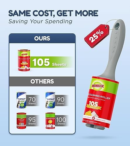 SAME COST, GET MORE! 315 SHEETS VALUE PACK! Get the most economical lint roller for pet hair in the market with 3 upgraded reusable handles and 3 roller refills now! Each MONSEK lint roller refill includes 105 sheets which are at least 25% more than other pet hair removers, greatly reducing the re-order frequency. SAVE YOUR MONEY!