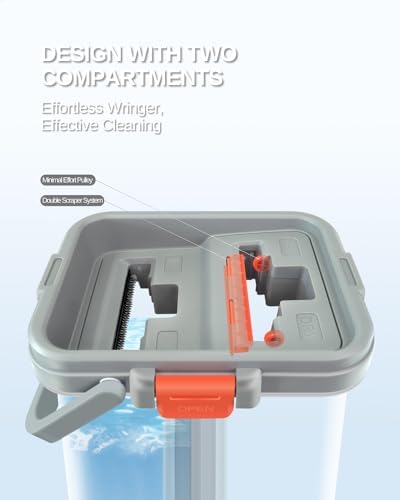 The bucket features a dual scraper system for wringing out excess water, making it easy to control the mop’s moisture levels and ensuring it’s always ready for optimal cleaning.