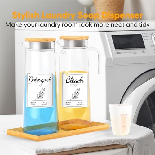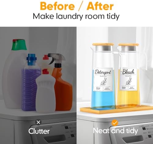 Liquid laundry detergent storage container includes a bamboo tray: The liquid laundry detergent dispenser with bamboo lid and bamboo tray, this farmhouse style set will warm up and upgrade your laundry room. And the bamboo tray just the right size to hold 2 54oz liquid laundry detergent dispensers and 1 measuring cup, so it’s ideal for keeping your laundry room neatly organized. The bleach container for laundry room is also suitable for different kinds of liquid detergent.