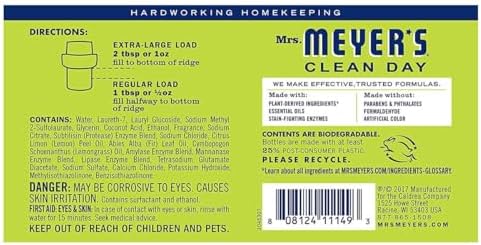 Mrs. Meyer’s Clean Day Laundry Detergent features hardworking yet gentle cleaning agents, while also providing a special, singular scent for your entire home. Concentrated and effective yet gentle on clothes, our laundry soap really packs a punch when it comes to removing dirt and grime. Contains surfactants from plant-derived sources, dirt- and other thoughtfully chosen ingredients and, of course, those important essential oils. This biodegradable Laundry Detergent is HE compatible for use in high-efficiency and conventional washing machines. Concentrated for 64 loads of laundry.