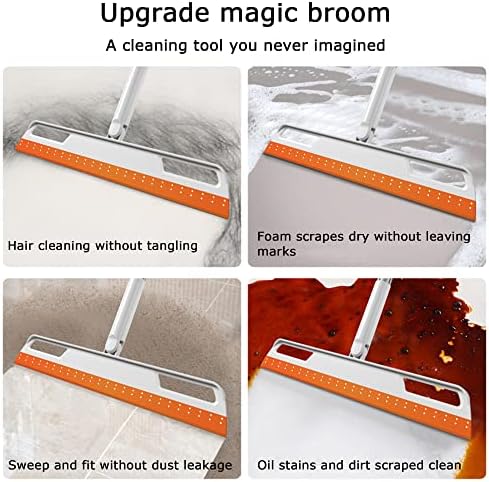 Perfect for Cleaning: Use the upgraded magic squeegee broom works perfectly for carpet, rug and floor cleaning, living room, kitchen, hard floor, tiles, swimming pool, garage, bathroom, can also be used as a window squeegee cleaning spray glass wiper. This floor squeegee is 14.96in long, It effectively sweeps out strands of hair, dust, sand, pieces of broken glass, any liquid, and more. The silicone head adheres to the floor and sweeps out everything without missing anything.