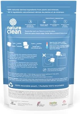 Safe for the whole family. Nature Clean Laundry Pacs are made with a low foaming formula that is vegetable based (derived from corn and palm kernel oil). It’s safe enough for infant clothing and great for high efficiency top and front loading machines and improved for cold water wash. It’s made without phosphates, potentially dangerous sulphates (SLES), chlorine, optical brighteners, enzymes, perfumes, dyes or any animal ingredients. This product is hypoallergenic and not tested on animals.