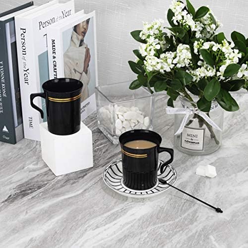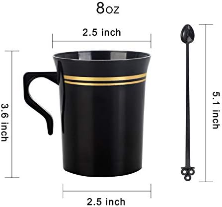 Specification: Color: black with gold Material: PS Quantity: 60 packs plastic coffee cups,60 additional freely stirrer Product Description: Nervure- We are focus on quality of life, providing premium products and making life more interesting. Set of 120 pieces, black plastic gold cups design is classic and elegant. Its quality is also very good, bending resistance. It is also made of food-grade plastic. Black plastic coffee cups are strong, customers can rest assured to use. As disposable cups, you can save time by throwing them away when you’re done using them. Of course, you can wash it and use it next time. What needs to be reminded is that disposable coffee cups cannot be placed in the microwave oven.