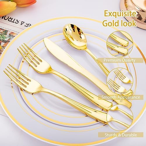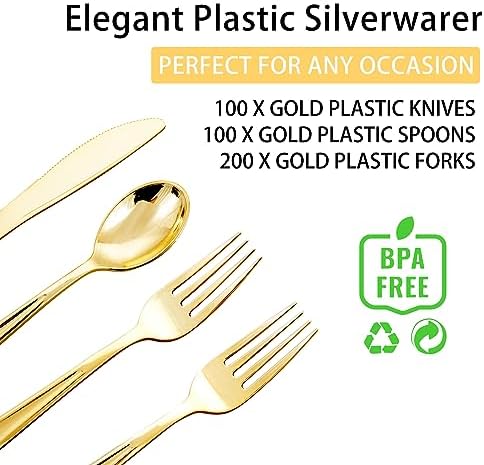 【GREAT VALUE PACKAGE】Our gold plastic silverware includes 200 forks, 100 knives and 100 spoons, which can serve 100 guests at once.