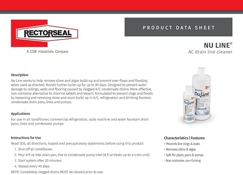 Nu-Line is the Industry Standard in A/C Condensate Drain CleanersItem Specifications: Nu-Line provides cleaning action for soil and build up and water deposits in air conditioner and refrigeration drain lines , pans and condensate pumps. Also for ice machines , drinking fountains and soft drink machine drain pans and lines. SAME PROVEN FORMULA…Brand New Packaging!