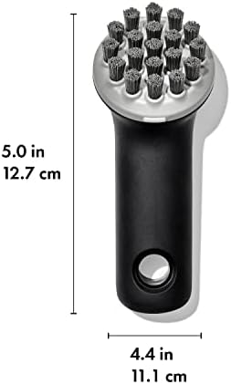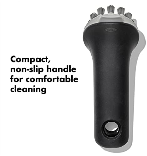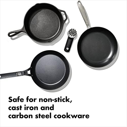 Our OXO Outdoor Cast Iron Brush is tough enough to tackle cast iron and carbon steel cookware, yet gentle enough for cleaning all your non-stick pots and pan. No need for soap or detergent so you can feel confident the seasoned surface of your cast iron and carbon steel will be protected. This specialty brush has a thoughtful bristle pattern designed to clean flat and ridged cookware, while the angled bristle design adds leverage so you can clean tough-to-reach grooves. A tough scraper helps get rid of those stubborn, greasy messes, while a compact, non-slip handle provides a comfortable grip. Dishwasher safe. Not suited for use with hot grills.