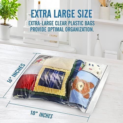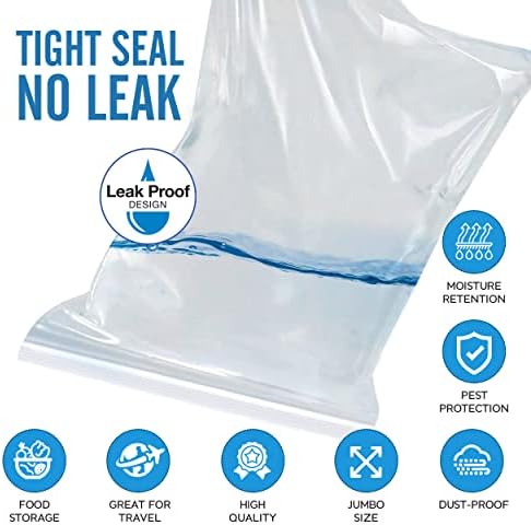 HIGH-QUALITY, SPACIOUS STORAGE BAGS. Large and durable, measures 16″ wide x 18″ tall, our 2 Mil. thick plastic bags will keep your food fresh and your belongings safe and secure. They’re clear so you can easily see the contents inside, and include a resealable closure for easy sealing and protecting the items inside.