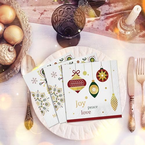Delicate Festive Design: these gold foil Christmas cocktail napkins feature an elegant Christmas ball and snowflake design with the words [joy peace love], [merry and bright] that will add a festive touch to your table setting; The design is delicate and stylish, featuring bright and vigorous colors that quickly attract the attention of guests, bring you a joyful Christmas atmosphere