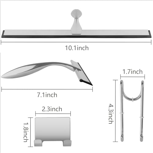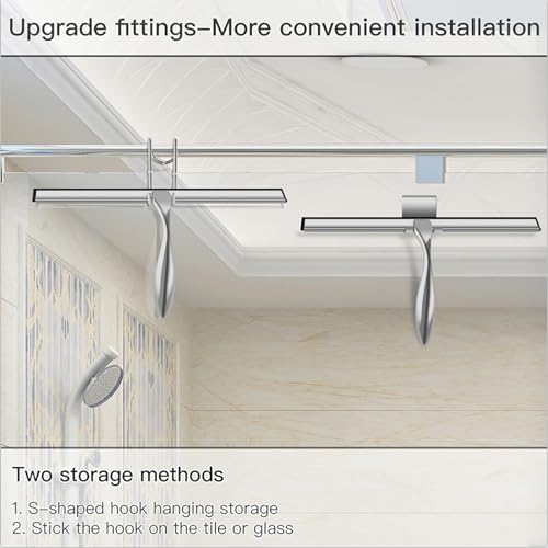Shower squeegee is made of stainless steel, 100% rust-resistant with unique usability and particular durability as a trait.The bath squeegee has an ergonomic design which feels comfortable to hold. The anti-slip details adds additional comfort and friction in addition to its essential characteristics, making it easy to grasp and use.The squeegee creates a convenient and noiseless cleaning method and make surfaces dry with no streaks.The squeegee allows you to cut your cleaning time. Use this product can greatly reduce your cleaning time, do not have to worry about glass, windows, granite&marble counter top, mirror and other easy to leave streaks of cleaning stuff.The squeegee includes double hooks for hanging anywhere.Easy to storage and easy to find.