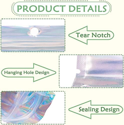 【Clear Window Holographic Bags】The shiny odor-resistant holographic bags are made of high quality materials and show beautiful rainbow colors when light is refracted. Featuring holographic rainbow colors and transparent front for clear product display.