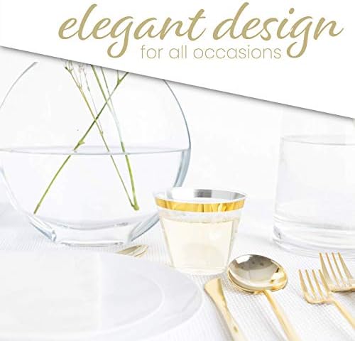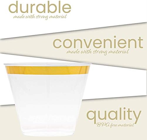 Plasticpro Disposable plastic 9 oz Clear Party Tumblers Old fashioned Design Wine Goblets with A Elegant Gold border Will Fit in To Any Upscale Event from birthday Party’s, to Weddings and Everything in Between & Will add An Elegant touch to your Event, & Will ad Extar taste to Your drink, 🙂