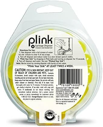 Plink Your Sink“Plink Your Sink” with Plink Garbage Disposal Freshener & Cleaner. This innovative and economical product effectively and safely freshens your garbage disposal and keeps it odor free. Plink washes away foul odors and leaves a fresh scent throughout your whole kitchen. It’s a quick, easy to use, no mess way to care for your garbage disposal. This fresh lemon scent leaves a pleasant fragrance throughout your kitchen. Garbage Disposal Freshener & CleanerThis innovative garbage disposal freshener and cleaner removes tough odors and delivers lasting freshness to your disposal and drain. Running your disposal with bursts of hot water revives the fresh scent throughout the sink, disposal, and kitchen. How often to use: Plink Your Sink at least twice a week or as needed. Performance Guaranteed. All of our products have a money–back guarantee, promising that every product will meet or exceed your expectations. If you’re not satisfied with product performance, mail your register receipt along with UPC to Summit Brands for a full refund. Plink is safe for all disposals, plumbing and septic systems. Made in North America.