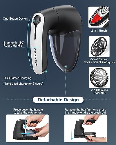 REVOLUTIONARY UPGRADE 3 in 1 FUNCTION: Our fluff cleaners include rechargeable fabric removers, removable electrostatic brushes and cleaning brushes. POPCHOSE lint remover is not only to remove the lint on the surface of the clothes, but also to maintain the original surface of the villi not damaged, refreshing and revitalizing your clothing.