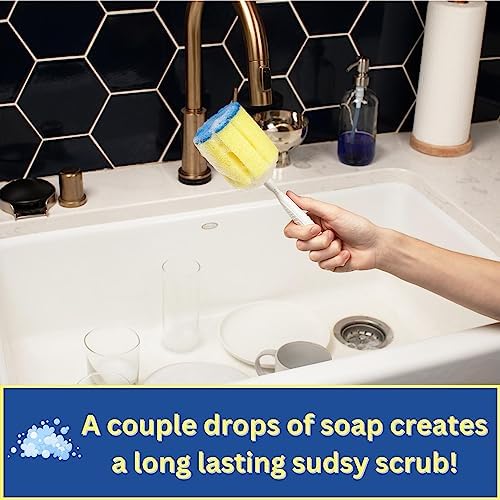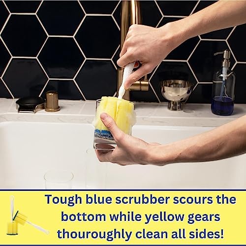 SCRUBS THE BOTTOM: the gear shaped sponge head makes sure to catch all surfaces and is paired with a scratch free blue scrubber that makes sure to scrub the bottom of all glasses, bottles and dishes.