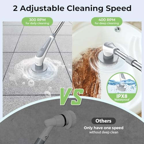 [Dual Speeds Up To 400 RPM] Distinguishing itself from other electric spin scrubber with single-speed limitations, the Prasky spin scrubber offers two adjustable spin speeds, significantly cutting down cleaning time for soap scum, grout, or stubborn stains from an hour to just a few minutes. Simply click to choose the low speed at 300 RPM (indicated by a green light) for everyday cleaning, or press to switch to the 400 RPM mode (indicated by a red light) for more intensive, deep cleaning.