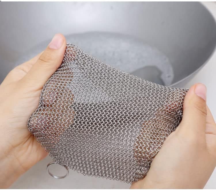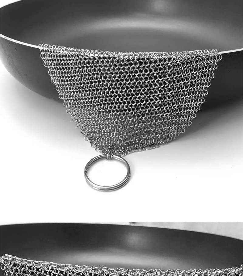 Perfected Cleaning Tool: Cast Iron Chainmail Scrubber Each ring is handcrafted with smooth edging for strength and comfort to protect the seasoning of your pans. It is manufactured with high grade restaurant quality premium Grade Stainless Steel.
