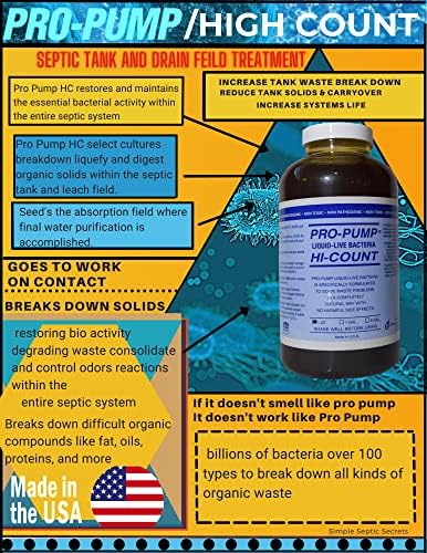 LOOK NO FURTHER You Have found the strongest most comprehensive Septic treatment on the market! Easy to Use Extremely Powerful! And Proven To Work. There is just nothing like the power of pro pump to give your septic tank the premium help it needs. Each Batch Is produced in a laboratory by highly trained microbiologist with over 40+ years of experience. Not only will Pro Pump REDUCE heavy sludge and paper saving you money on extra pumping fees nothing works as well in your leach field to REMOVE the bio matt that causes total system failure. If you want to extend the life of your septic system whether its new or old you need the industrial strength Power of Pro Pump Septic Saver.