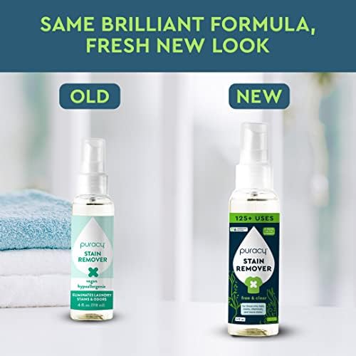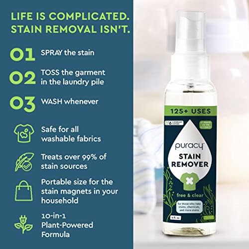 Puracy Stain Remover for Clothes, Laundry Spray for Fresh & Set-In Clothing Stains, Enzyme-Based Laundry Stain Remover, 98.95% Plant-Powered Natural Stain and Odor Cleaner, Free & Clear, 4 Fl Oz Travel Size Stain Remover