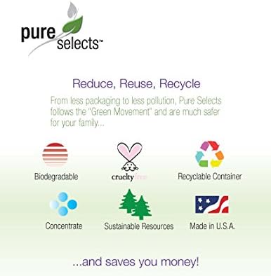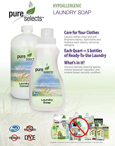 The Pure Selects Natural Liquid Laundry HE Detergent Concentrate – dilutes to make up to 4.5 quarts of ready to use product. (Free Dispenser Bottle included) Feel free to use on delicates to your toughest laundry challenges! The Pure Selects line of natural products are contain no: SLS, ALS, Dye, or Added Fragrances. Each quart comes with a dispenser bottle. Simply pour the concentrate into the dispenser bottle to the fill line, add water, and shake. Why pay to ship water across the country? Superior Cleaning Results without all the chemicals! Your clothes come out clean and fresh while you save money while being good to your home environment and the environment in general. Clean. Green. Saves! Pure Selects products are manufactured in the USA from superior naturally derived ingredients.