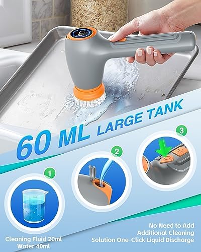 𝐄𝐥𝐞𝐜𝐭𝐫𝐢𝐜 𝐒𝐜𝐫𝐮𝐛𝐛𝐞𝐫 60𝐦𝐥 𝐖𝐚𝐭𝐞𝐫 𝐓𝐚𝐧𝐤: Simplify your cleaning routine with our 60ml electric cleaning brush water tank, specifically designed to hold your cleaning solution. For added convenience, we recommend mixing a 1:2 ratio of cleaning solution to water in a measuring cup and then pouring the mixture into the spin scrubber water tank. Spray cleaning fluid as needed during the cleaning process, eliminating the need for frequent refills.