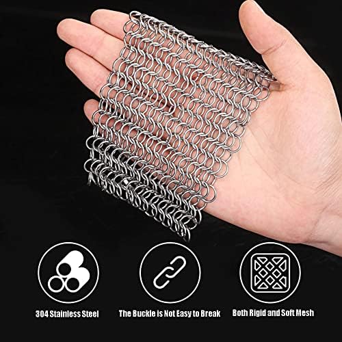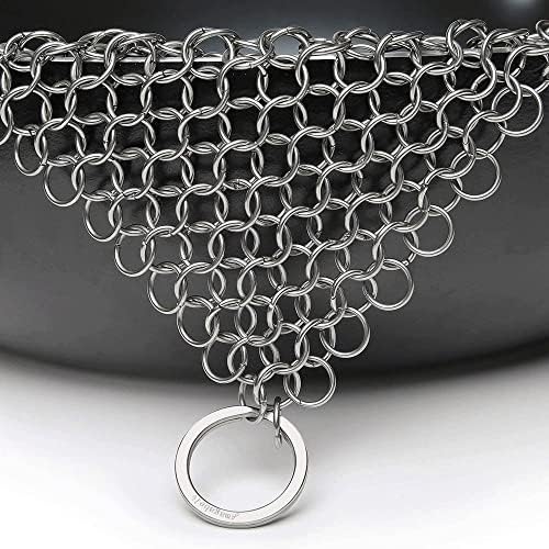 【Multipurpose】: This chain mail multi-purpose scrubber is ideal used for cast iron, cast iron pans, skillets, glassware, stainless steel, a pizza stone, plates, baking sheets, a teapot, cookie sheets, cauldrons, camp chef griddles, tortilla press, a hibachi, a waffle maker, a pie pan, a dutch oven, griddle, woks, and casserole dishes.