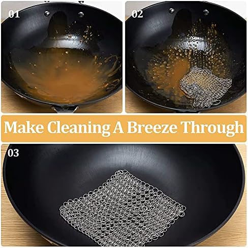 High quality of rust proof, corrosion resistant 316 stainless steel, hygienic, safe and durable. Reusable tool, removes even the most stubborn grime and grease from your cast iron cookware. Helps to effortlessly clean all your cast iron products without stripping away accumulated flavor and seasoning or scratching your pans. Perfectly shaped to fit nicely in your hands, and can be easily stored or packed up with the hanging rang. Perfect household cleaning tool, grilling & BBQ utensil, grill scrapers, outdoor cooking tools & accessories.