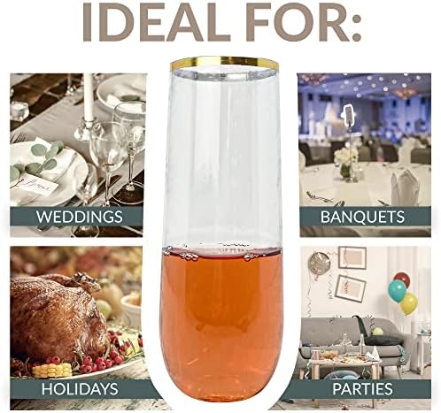 Durable & Disposable: Our clear, gold-rim plastic champagne flutes are BPA-free & recyclable with a stemless shape and smooth lip finish – ensuring stress free sipping & easy gripping.