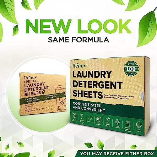 HASSLE-FREE LAUNDRY EVERY TIME: Renuv’s innovative one-sheet-per-load design for 1 big load of washing eliminates the need for measuring. Simply drop one paper laundry detergent sheets from our recyclable box into your washer, and you’re done! For lesser loads, it can be cut in half; Includes 1 box of 50 sheets for up to 100 loads of laundry. Septic safe washing detergent sheets compatible with all types of washing machines.