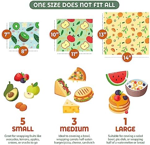 ♻️ ONE SIZE DOES NOT FIT ALL: Size and Quantity would matter! Our design is triple than the popular quantity and sizes for your daily uses. 9-PACK includes 5 Small (7″ x 8″), and 3 Medium (10″ x 11″), and 1 Large (13″ x 14″) wraps. Different sizes can cover different foods depending on your demand.