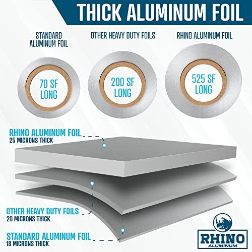 Easy To Cut Rolls: Rhino Aluminum Foil Has Plastic Ends That Fit Into The Core Of The Roll In Order For The Aluminum To Slide Out As Easy As Possible. This Allows You To Have A Seemingly Easy Time To Keep Around The Kitchen And Use Without Wasting Any Foil. Made from excellent quality, this foil is 25 Microns thick as well making it extremely durable. 18 inches wide and 525 sf, this foil roll will be long lasting and great to have around in the kitchen.