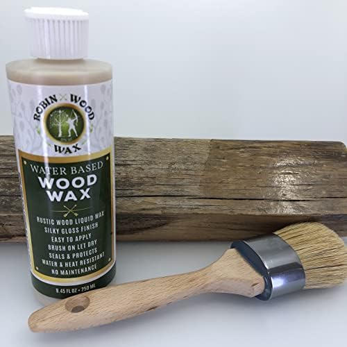 2 in 1 wood wax/sealer & brush. SEALS & PROTECTS. Easy and quick to apply, squeeze on bottle, just brush on and let dry, that’s it! No more buffing or polishing! Easy maintenance, just wipe clean with a damp cloth. Leaves a silky wax look and feel that’s water and heat-resistant. Protects against stains & ring marks! More durable and longer lasting than regular paste waxes and without the hassle! Robin Wood Wax is a water-based, environmentally friendly supreme wax with very low odor. Use on all types of reclaimed, rustic & raw wood, furniture, beams, paneling etc. Excellent over chalk paint finishes and on your existing paste wax finish. 250 ml bottle covers approx 40 sq ft.Made in USA.