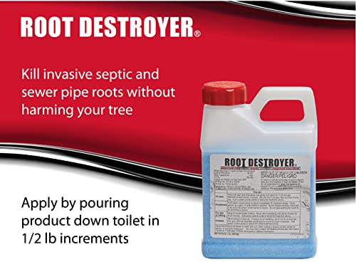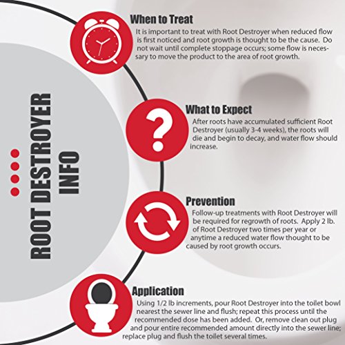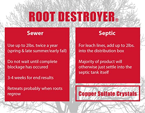 Use Root Destroyer at the rate of 1 lb. in an active 150 gallon septic tank 2 twice a year or anytime you have reduced water flow thought to be caused by root growth occurs.