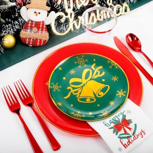 Complete Tableware Set: This christmas red dinnerware set includes red plastic christmas dinner plates, green dessert plates, cups, plastic red cutlery, and napkins, making it convenient for you to host a hassle-free party. All the essentials are included, so you can focus on enjoying the event.