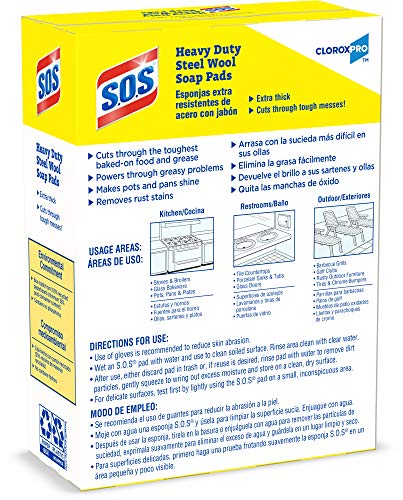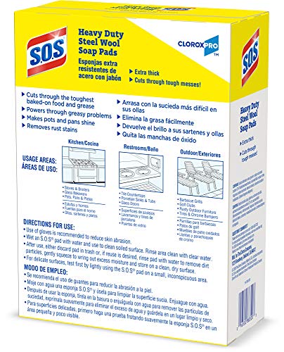 S.O.S Steel Wool Soap Pads are tough so you don’t have to be. Made with durable steel wool and saturated with long-lasting soap, these pads cut through even the toughest baked-on, greasy, grimy messes. They are perfect for cleaning ovens, broilers, cookie sheets and pots and pans. These reusable steel wool soap pads are great outside the kitchen, too. From scrubbing stoves and shower doors to cleaning grills and golf clubs, S.O.S Steel Wool Soap Pads quickly removes stubborn grease, rust and stains inside and outside the home or workplace. The soap contains rust inhibitors, preservatives, biodegradable soaps and detergents, a pH buffer, fragrance and color. From Clorox Commercial Solutions, these steel wool soap pads are ideal for use in restaurants, cafeterias, hotels, break rooms and other commercial facilities. Cleaning is quick and easy with S.O.S.