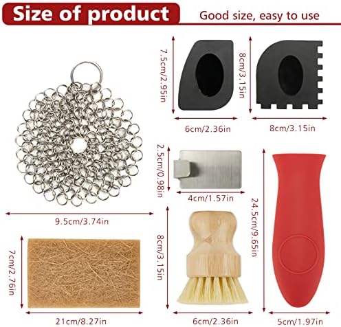 Specification :The Chainmail Scrubber -circle mesh is 4×4 inch;Bamboo brush with Sisal bristles-hard enough to clean your cast iron cookware;Silicone handle holder with temperature resistance up to 445 °F,keep your hands away from grease;Grill Scrapers is durable and hard enough to eradication remove hard residue from pan or pot;2 sponges made by coconut walnut style,soft and good at water absorption and Scrubbing;stainless steel hook is adhesive well,Will not fall off from wall easily.