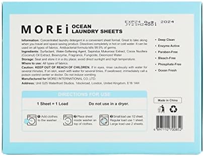 ✔️GREAT FOR SENSITIVE SKIN,All NATURAL, NO HARM TO BODY- our formulas are made without harsh ingredients that cause skin irritation. Morei laundry detergent sheets are vegan-friendly and paraben-free and are gentle enough for even the most sensitive skin. NO florescence, NO Phosphorus, NO Fragrance, Septic Safe and is HE compatible, making you get good habbit of washing you clothes more frequently and love washing your clothing and keeping fit!