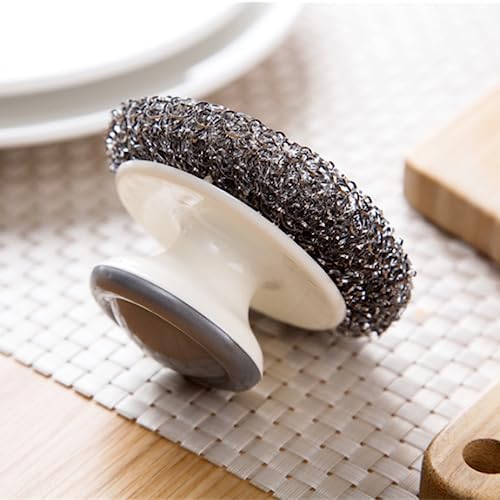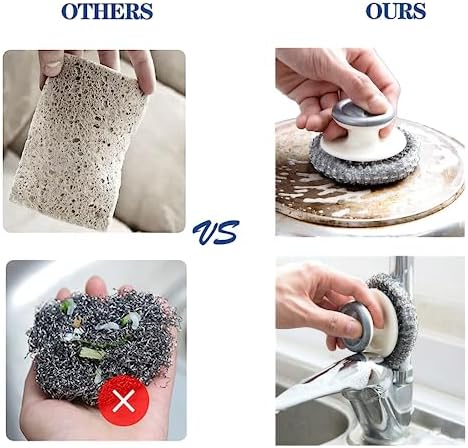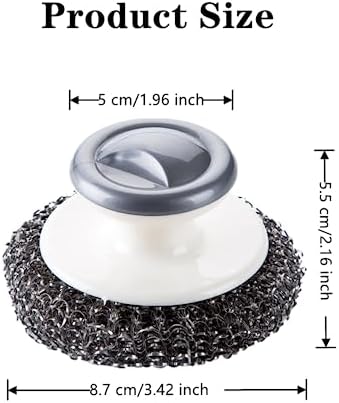 Material: Made of high-quality stainless steel, rust-proof, wear-resistant, soft and elastic, not easy to loosen and durable. Size: 3 pieces, each piece is about 8.7 * 8.7 * 5.5cm /3.42*3.42*2.16 inches. Meet your daily use and replacement needs. Design: The top of the stainless steel scrubber is raised, and the handle is ergonomically designed, which is easy to grasp, comfortable and convenient. Can avoid direct contact with various oils and detergents, and better protect hands. Efficient cleaning: Stainless steel scrubber with handle can easily remove hard dirt and grease, as well as rust at the bottom of various pots, making them as bright as new. Of course, you can use it with cleaning agent, which has better removal effect and higher efficiency. Widely used: Stainless steel scrubber with handle is very suitable for kitchen, bathroom, garage or outdoor use, suitable for scrubbing pans, pots, grills, baking pans, plates, sinks, range hoods, faucets, tiles, floors and so on.