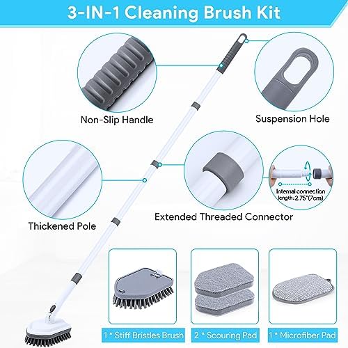 ✔️【52″ Adjustable Long Handle & Easy to Assemble】The pole of the bathroom scrubber can be extended from 20.4″ (51.8cm) to 52″ (132cm). Adjust its length according to your needs. No more bending, crouching or climbing, especially friendly for those with back and knee issues. Shower brush for cleaning can be easily assembled by twisting the extended turnbuckle. Bathroom cleaner brush also can be used as a hand-held brush when the pole of the bathtub scrubber is removed, which is convenient