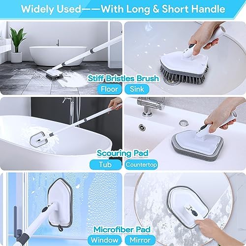 ✔️【3 Detachable Brush Heads】Cleaner brush has 3 brush heads with different functions, which can be removed and replaced easily. Unique V-shaped design for better cleaning of corners and grooves. A stiff bristle brush can be used to clean the tile floor and sink. Scouring pads retain water for scrubbing, highly deep cleaning while non-scratch. Perfect for scrubbing soap stains from tubs and countertops. Soft microfiber pads can be used to clean smooth surfaces such as mirrors or window glass