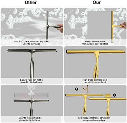【Durable and long lasting】 Shower squeegee with hook is made of high-quality stainless steel, reinforced at the interface. The bathroom shower squeegee blade is made of soft silicone material, clean without leaving gaps and no noise.
