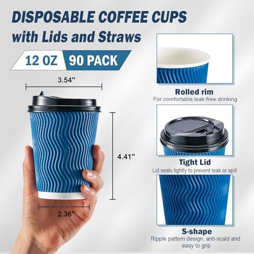 GREAT VALUE BULK PACK: Package contains 90 12 oz. disposable coffee cups, 90 black snap-on lids and 90 stirring straws. Ideal for home and commercial use.