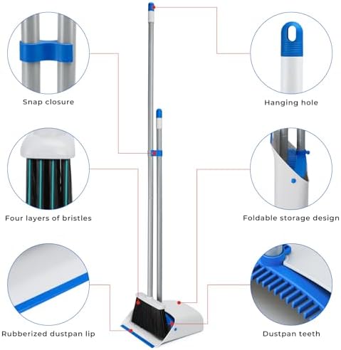 Broom and Dust Pan Sets Features: Our dustpan lip is made of soft rubber, which easily fits the floor and collects dust conveniently, In addition, there are holes in the handle part of the dust pans with long handle that can be hung, and the product is also provided with upright storage.