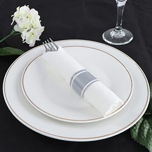 [Package Contents]: 300 silver plastic cutlery sets; Each individual unit consists of a 7.9-inch (20cm) long knife, a 7.4-inch (18.8cm) fork, and a 6.9-inch (17.5cm) spoon wrapped in a folded napkin and a matching napkin band