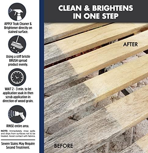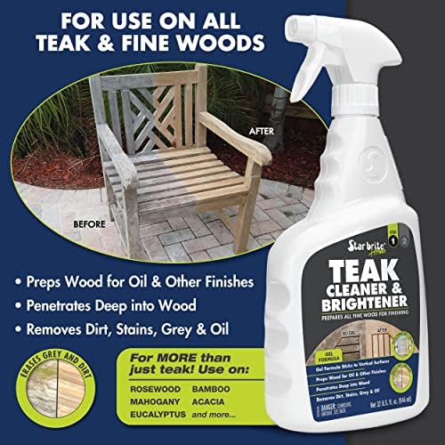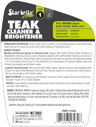 Introducing the STAR BRITE Teak Cleaner & Brightener Gel Spray, the ultimate solution for restoring the natural beauty of your teak wood surfaces. Our unique gel formula ensures it clings to vertical surfaces, allowing for a deeper and more effective clean. Whether you’re prepping your wood for oil or other finishes, this product ensures a smooth and ready surface. Following up with our premium teak oil seals in protection from the elements, preserving the wood’s rich color and grain. Ideal for a wide range of wood types beyond teak, including acacia and mahogany, these products ensure your wood surfaces remain pristine and durable against the test of time and use. Ideal for both indoor and outdoor teak furniture, decks, and more. Experience the difference of a product that not only cleans but also brightens, giving your teak wood a rejuvenated look. With STAR BRITE, you’re choosing a trusted name in wood care. Our formula is designed to be gentle on the wood while providing a thorough clean. Say goodbye to grime, dirt, and old finishes and hello to a brighter, cleaner teak surface. Trust in a brand that prioritizes both quality and user satisfaction. STAR BRITE Teak Cleaner & Brightener is the choice for professionals and homeowners alike. Suggested Uses and Application Areas: Indoor teak furniture, Outdoor teak decks, Teak wood flooring, Boat decks, Teak wood accessories, Garden furniture, Poolside loungers, Teak wood railings, Patio furniture, Teak wood panels. PREPARE SURFACE: Start with a dry surface. For stained areas, use STAR BRITE Teak Scrub to remove even the most stubborn discoloration. DIRECTIONS: Badly weathered (grey or black) teak: Apply STAR BRITE Home Teak Cleaner directly to dry wood. Spread cleaner with stiff bristle cleaning brush or a STAR BRITE Medium Scrub Pad. Allow product to remain on surface for approximately 1 to 2 minutes, then scrub in the direction of wood grain to ensure deep cleaning. Rinse thoroughly with fresh water. Lightly