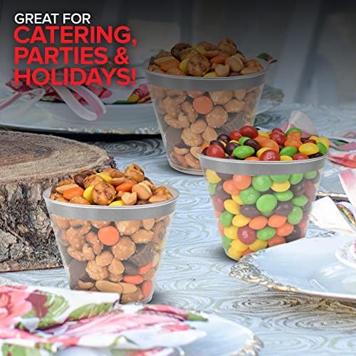 Great Value Pack: Comes with a 100 count of silver-rim cups. Each cup has a 9oz capacity. Dimensions: 3.5″ Top Diameter x 2″ Bottom Diameter x 2.75″ Height.