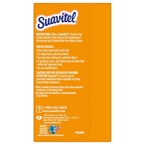 DRYER SHEETS DIRECTIONS: Place a SUAVITEL fabric softener dryer sheet on top of wet laundry in the dryer at the beginning of the drying cycle. Discard after the drying is done