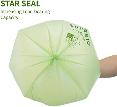 PRODUCT FEATURES: SUPERBIO bags are compostable and biodegradable. They are guaranteed to remain strong, durable and tear-resistant when used in accordance with the recommended usage directions. Patented processing technologies. Handle tie and star sealed reinforced bottom to securely hold even the heaviest load.