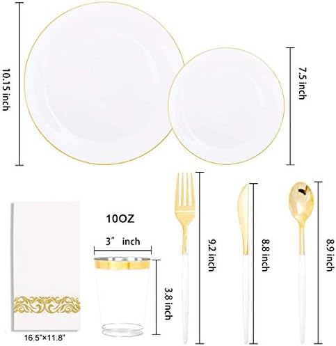 Value Pack: gold dinnerware set include 50 dinner plates, 50 salad plates, 50 knives, 50 forks, 50 spoons 50 napkins and 50 gold rim cups.Put in a sturdy box which can be gift too.